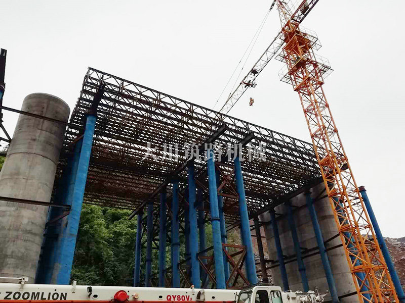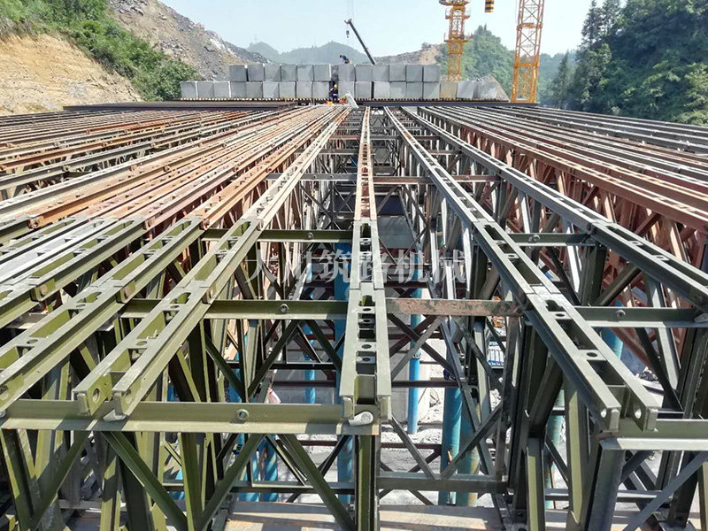 特點(diǎn):現(xiàn)澆梁支架平臺(tái)的跨度大,高度高,施工現(xiàn)場(chǎng)場(chǎng)所地非常有限,在局促的場(chǎng)地中和其他施工隊(duì)伍的場(chǎng)地需交叉作業(yè)。安裝過(guò)程中因拼好的主梁沒(méi)有平整的場(chǎng)地放置,需要在拼好的貝雷片上面拼裝對(duì)接;有些梁也因場(chǎng)地原因致使吊機(jī)沒(méi)有好的停車(chē)位,不能整根梁吊裝,采用半根梁吊裝在空中對(duì)接方式完成安裝,施工難度較大。